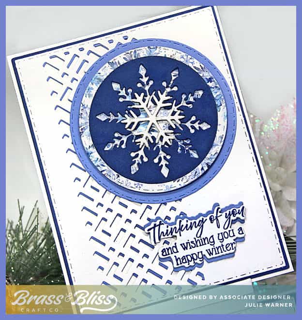 To make my card, I die cut the white panel with a stitch dot rectangle then placed the inset die toward the left side. It’s a little longer than my rectangle so I only cut it partially down the side. I also cut a cornflower blue panel with the same die then attached it behind the white panel, a little offset. This lt blue shadow just barely shows, but it adds depth & interest. I added a navy blue frame behind it. I had to trim it a bit in area behind the inset so it wouldn’t show thru. The large snowflake was cut out of navy instead of using the snowflake, I used the negative, cut around it w/ a circle die & attached it to a circle of the designer paper. The designer paper circle was the same size as the navy one, so I used a slightly smaller circle to cut the outside of the dp version & made a frame out of it, & attached it on top of the navy circle. A larger cornflower blue circle was added behind it. The smaller snowflake was cut out of white glitter & added in the center. The greeting was die cut & I used the same die to cut 2 of the lt blue, then offset them behind the greeting to form a shadow.