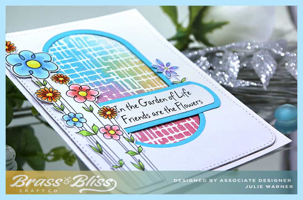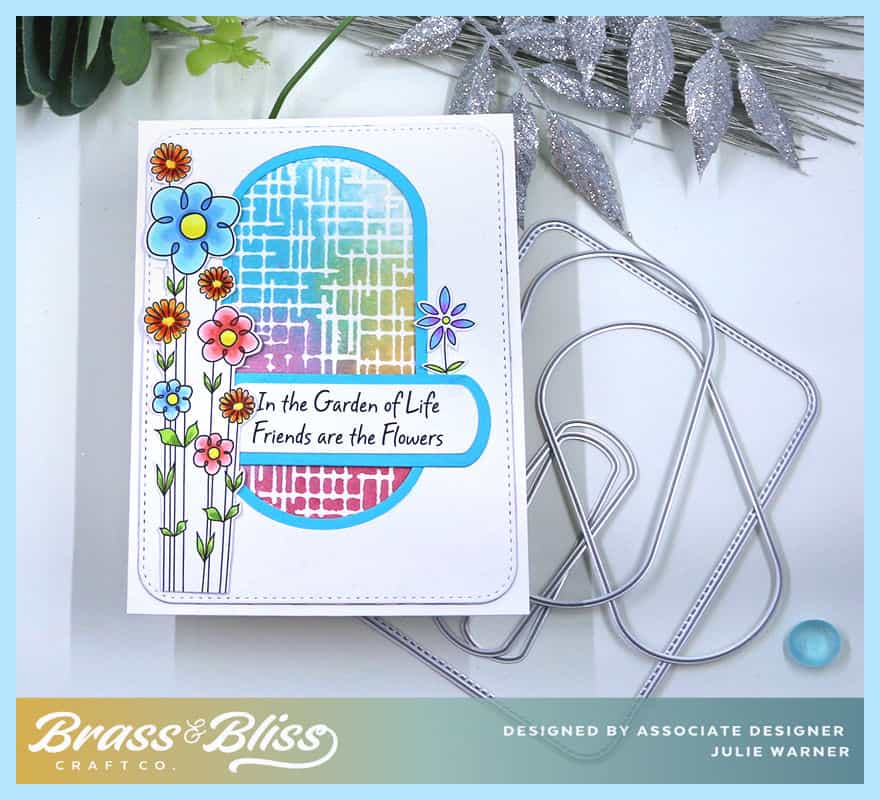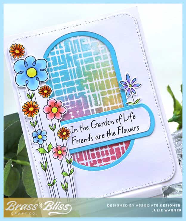 I had colored these flowers quite a while ago & today was the day I used them. The multicolor inset is also something I made quite awhile ago & the colors fit in w/ my tall skinny flowers. It was made by spritzing the inside of a grid embossing folder w/ shine sprays which have a nice shimmer to them. The paper was placed inside the spritzed folder. closed then rubbed by hand. I found you can also run it thru the Sizzix if you take away all the shims so that it doesn’t really emboss, just presses the folder to the paper. I die cut a white panel first w/ a rounded rectangle then used a swanky oval to cut out the center. I used the next size smaller oval to cut a bright blue layer to border the inside. The smallest ovals were used for the greeting. The flowers were fussy cut. Parts of the greeting & flowers are popped up to even them out since they’re on different levels in places.