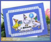 This is a fun little birthday card featuring some adorable little party ducks! The whole set is so cute and the ducks and greetings all have matching dies. How cool is that? Color them up in whichever colors you like, add some frames & paper and done!