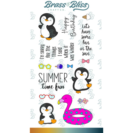 For my summer penguins card, after stamping, coloring & die cutting them, I die cut the new polaroid frame and used a separate piece behind it. On that, I used a wave & a cloud stencil to add some background, then added the die cut palm tree before attaching the penguins & frame. A little stickles was added to the ice cream & waves.