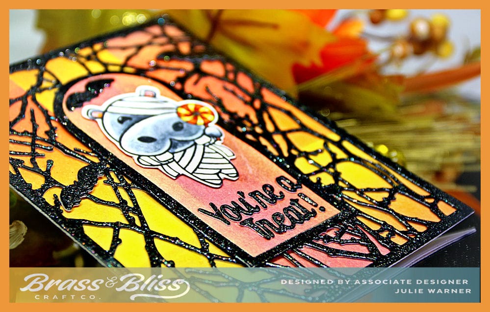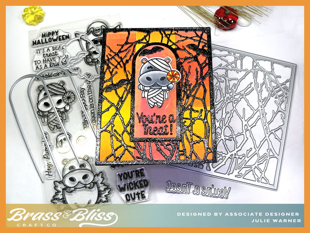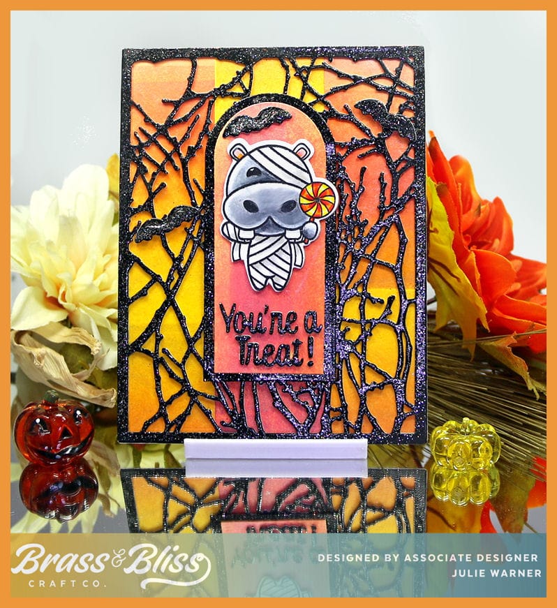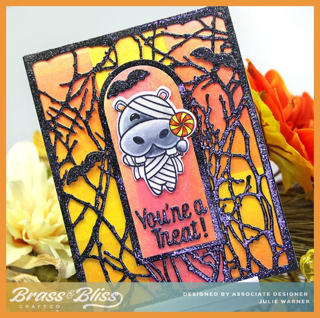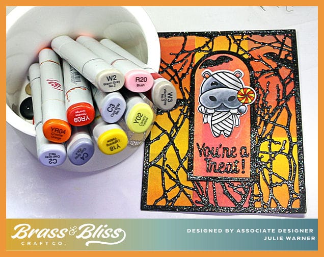 Halloween cards are so fun to make. You can use fun colors, images and some sparkle never hurts. This card uses all of those and is not hard or complicated. Only the little hippo was colored and the twig background & greeting dies were heat embossed with glitter powder.