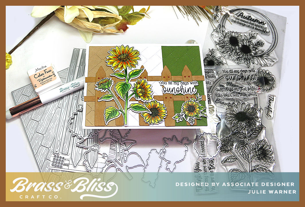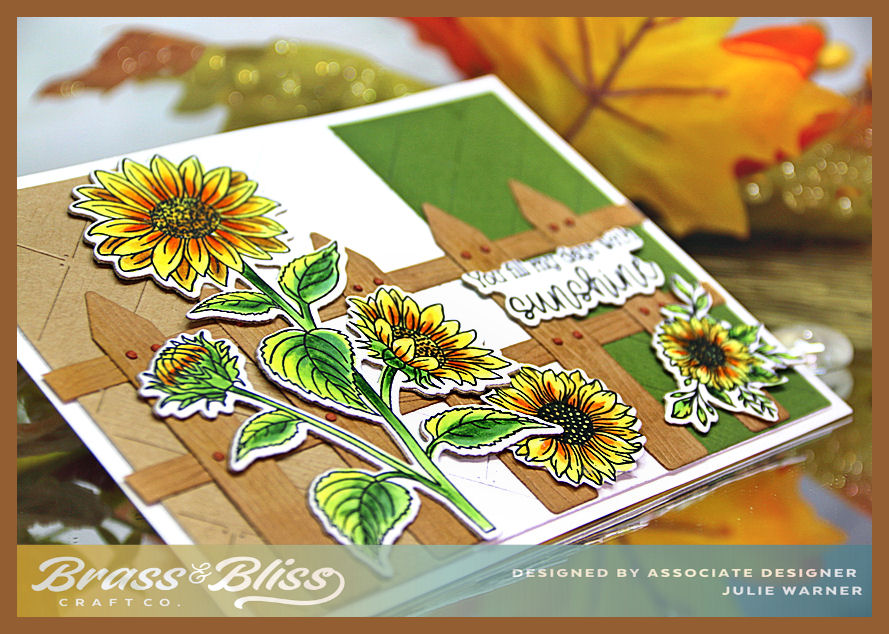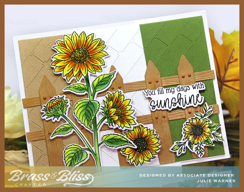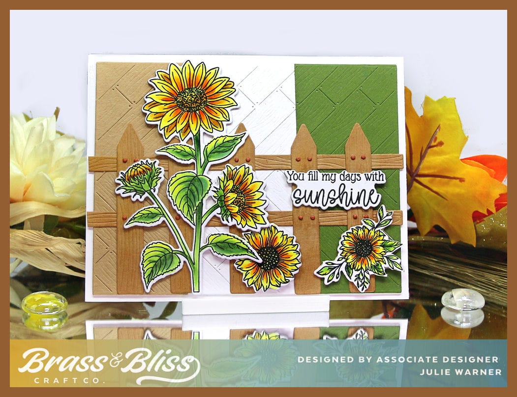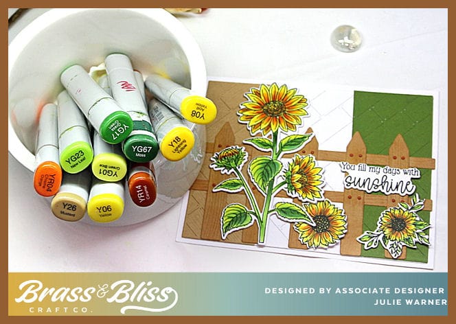 After coloring & die cutting the sunflowers, I also popped them up one layer. The wooden fence was die cut out of Kraft & I added a little extra color w/ a lt brown ink. For the background, I cut 3 narrow panels out of Kraft, white & green, taped them together on the back, then die cut them w/ the wood panel plank die. It also works to die cut 3 whole panels & divide them then piece them back together as a multi color background, but it’s a little more work as some pieces won’t want to stay together. The fence was attached on top of the bg & then the sunflowers & greeting added.