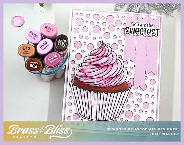 To make my tasty cupcake, I colored & die cut it. The wrapper was white, so I used a couple of pink Copics to add the polka dots. It’s popped up one layer & I added stickles on the icing highlights. It was attached to a white background die cut w/ the new Swiss Cheese cover. It’s also popped up one layer. The little flag banners were cut out of mauve & added in the upper right w/ the greeting on top. The whole front is attached to a larger piece of the same mauve pink.