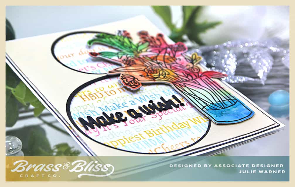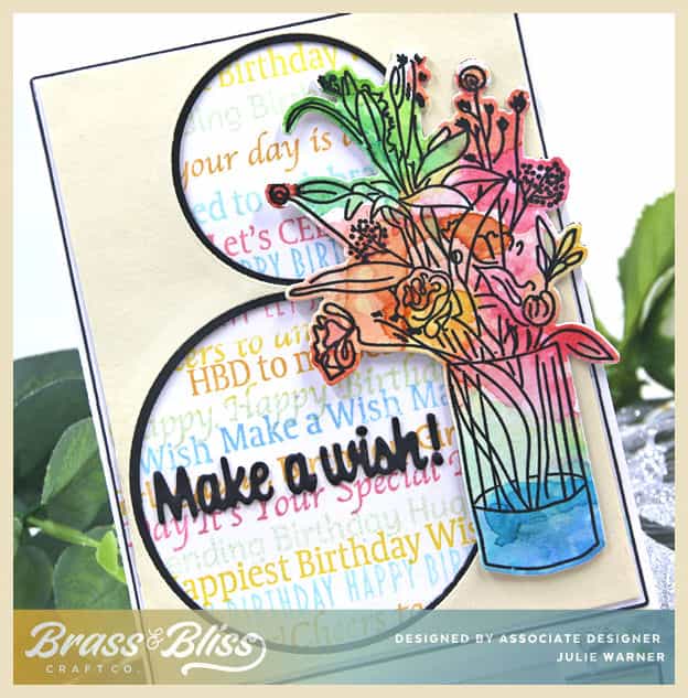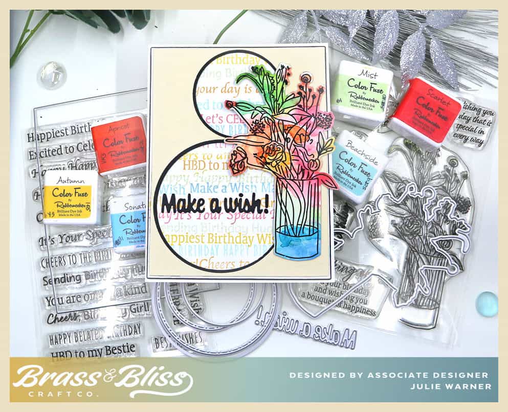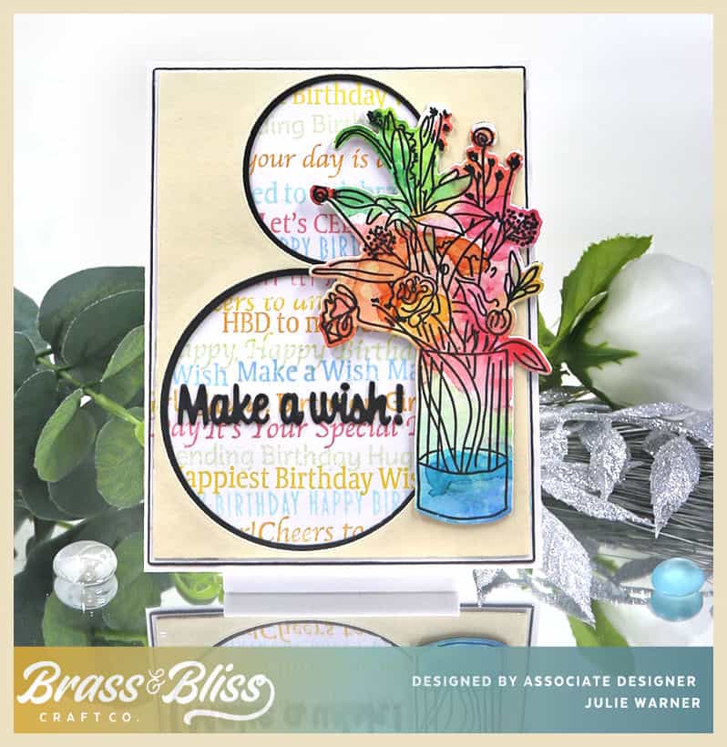 | Accessories: Brass & Bliss: Vase of Blooms, Rectangles, Circles, Birthday Wishes Sayins dies, MISTI, Brushos watercolor crystals |