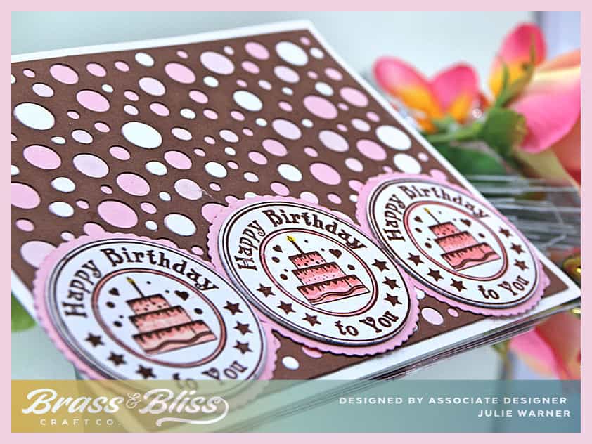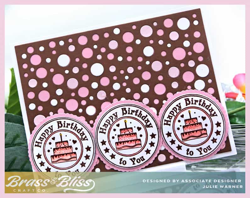 For my card, I stamped the birthday circles w/ brown ink, added just a bit of color to the cakes, then die cut them w/ a circle die. They are popped up one layer before I attached them to a slightly larger scallop circle die cut. The background was die cut w/ the Swiss Cheese cover in chocolate brown & attached to a piece of bubblegum pink. I pieced in some white circles & pale pink into some of the openings to mimic a multicolor polka dot paper. The birthday circles were attached at the bottom.
