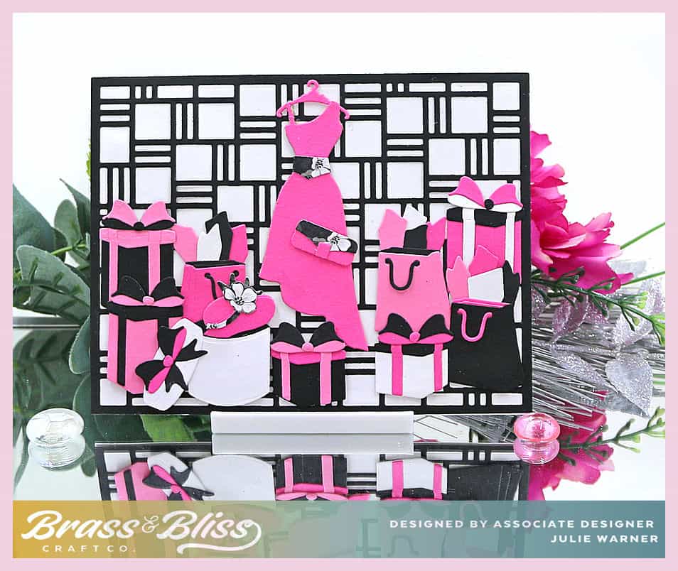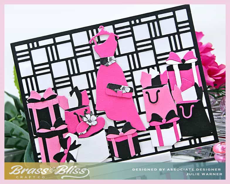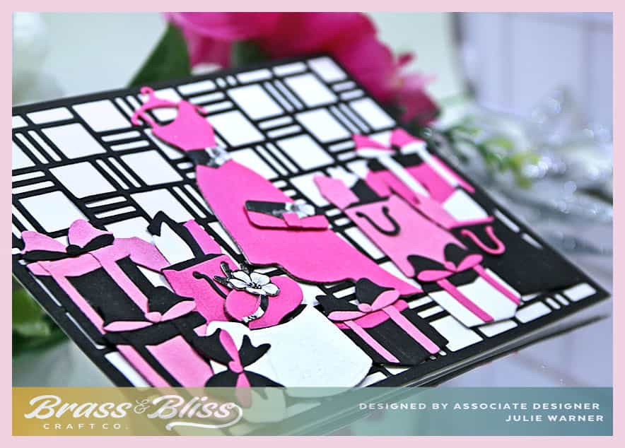 To make my card, I die cut the lattice cover out of black & attached it to a white layer. I die cut the packages, gift bags, bows & ribbons of out white, black, and 2 shades of bright pink. I used the brightest pink for the dress, hat & purse. Some little scraps of black & white flower print paper just for a little accent on the hat, dress & purse. Then it was just a matter of mix & match with the colors for all the presents. By the way, you’ll love that all these presents & bags come in dies facing in two directions. You can see that half are facing left & the others are facing right.
