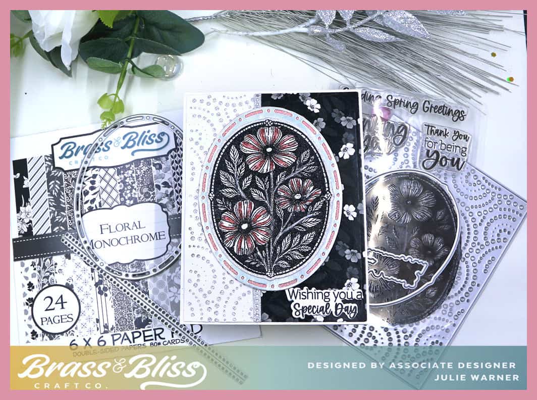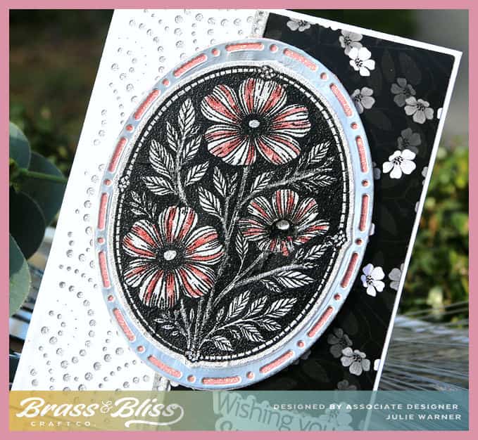 | Accessories: Brass & Bliss: Spring Greetings, Dot Dash Ovals, Circles Cover, Classic Edge Cut dies, MISTI, black embossing powder |
