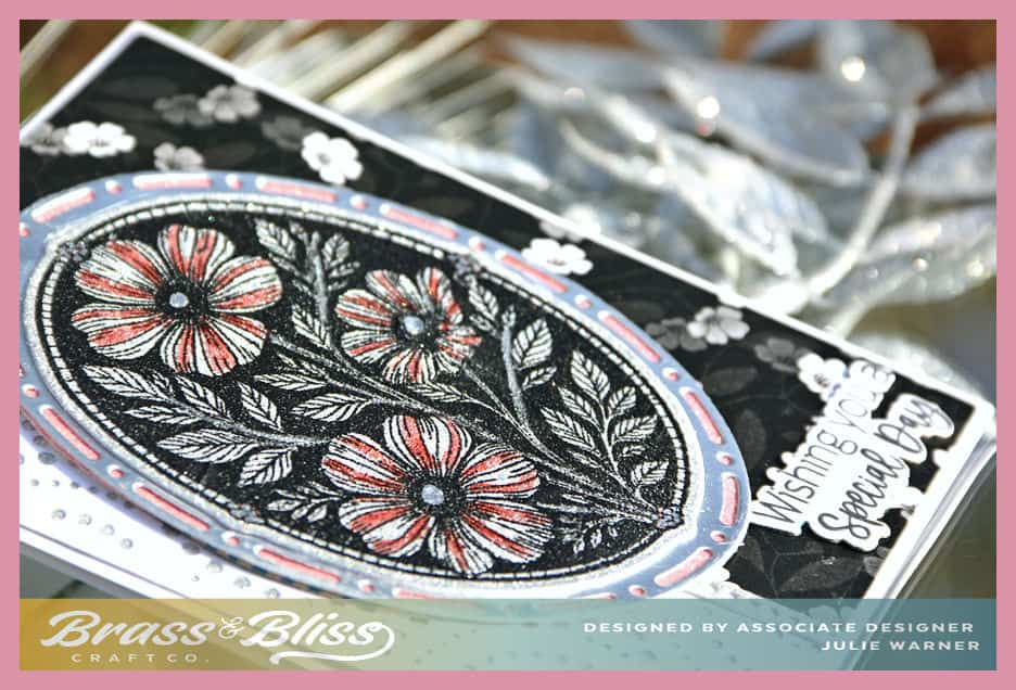 To make my super sparkly card, I stamped the oval multiple times w/ Versclair ink, the black embossed it on smooth, silver glitter paper. After die cutting it w/ its coordinating die, I also die cut metallic silver Dot Dash Oval then backed it w/ peachy pink glitter paper. To tie it together, I used a peachy pink marker to add just a little color to the flowers. The white strip was a die cut cover that I had left over from another project. I backed it w/ the same silver glitter paper I used for the oval. I also cut a narrow strip of this w/ an edge cut die to place over the join between it & the black & white designer paper on the right. The greeting is perfect for birthdays, Mother’s Day, graduation, or any special occasion.