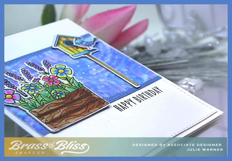 For my card, I started by coloring the flowers, bird & birdhouse then die cut them & popped them up one layer. Then I set about making the stenciled strip. I used the rectangle stitch die to cut the long strip then started w/ the swirl stencil & used blues & one purple ink. A light blue was blended across the entire panel. The large circles of the bokeh (2 part) stencil was used with a little darker blue then the smaller circles using the darkest blue ink. Finally, the falling snow stencil was used w/ white pigment ink. I used a heat tool to make sure it was completely dry before attaching it to a piece of white & die cut w/ the largest stitch rectangle. I also added a couple of blue border on top & bottom w/ the stitch edge cut die. The greeting was stamped below before I attached all the images.
