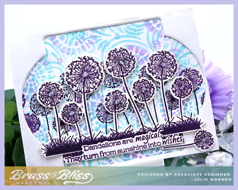 To make my card, I started with the background. I used 3 colors of ink & 2 stencils. First the circle paver then I used the swirls on top w/ just a little of lightest turquoise ink. I wanted to give it that magical, swirling movement. The row of dandelions was stamped directly on top using a purple pigment ink. I also stamped just the ends to lengthen it across the panel. The popped up row of dandelions was stamped w/ the same ink & die cut to add on top of the frame. I took another piece of white & cut out the center w/ the largest rounded Marquee die to make the frame. The die cut greeting and small dandelion were added at the bottom. A little glitter glue was added to the flower centers.