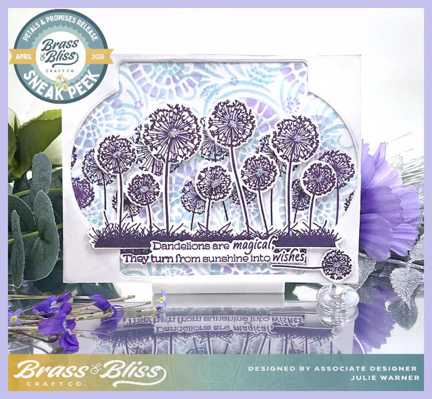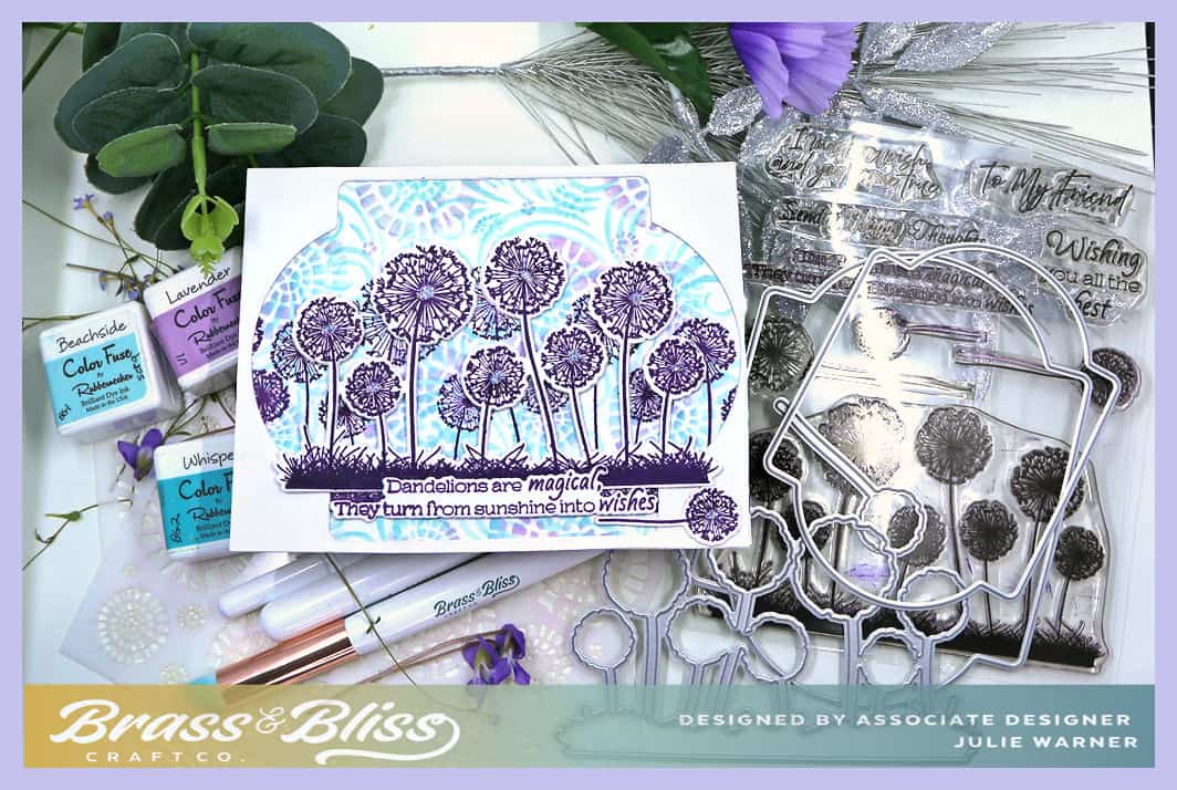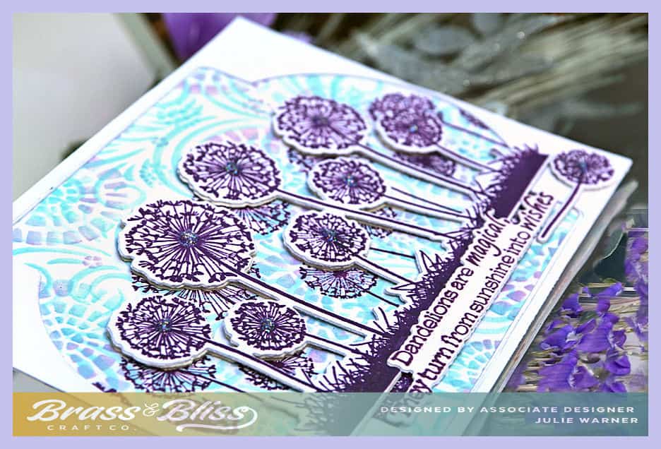 My card today is a dual row of dandelions. The front yard has dandelions a plenty right now but instead of white, I made mine purple with glittery centers. These dandelions are so fun and you can do a whole row of them or just a few. The matching dies make it so easy.