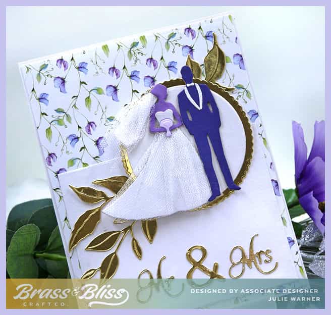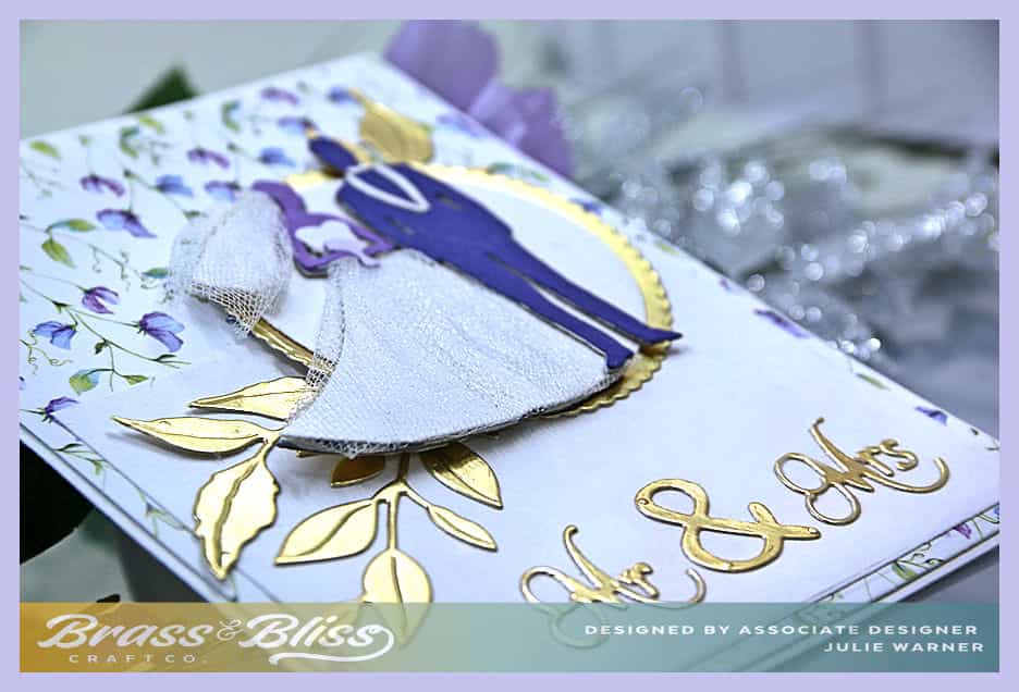 To make my card, I die cut the wedding couple, her out of a lavender & him out of a dark purple. I used white for the dress, veil & tux collar. I had some tulle, so I folded some into pleats & wrapped it around her dress & veil. The leaves, greeting & scallop circle were cut out of mirrored gold. I used the ampersand from a fab new set, but wanted the Mr & Mrs so I cut them from a Merry Christmas script die then snipped & pieced them together. Here’s a hint for lining them up to attach to the card: line the letters (or words) up as you want them. Cover them w/ a piece of tape that’s barely sticky. I used transparent tape that I stuck to my t-shirt several times to take most of the sticky off. Then add adhesive to the backs of the letters & place on your card where you want them. Rub it down slightly, wait a minute, then gently pull the tape off. Then the rest of the card was assembled.