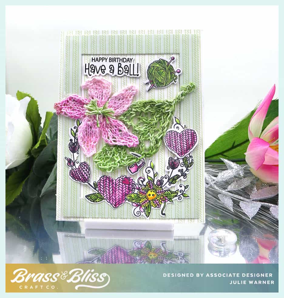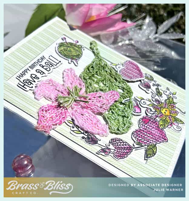 | Accessories: Brass & Bliss: Rectangles, Loops of Love dies, Misti, lace knitting needles, cotton crochet thread |