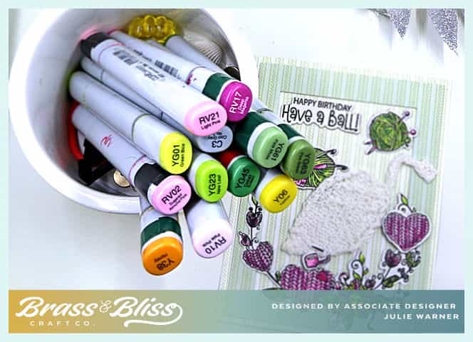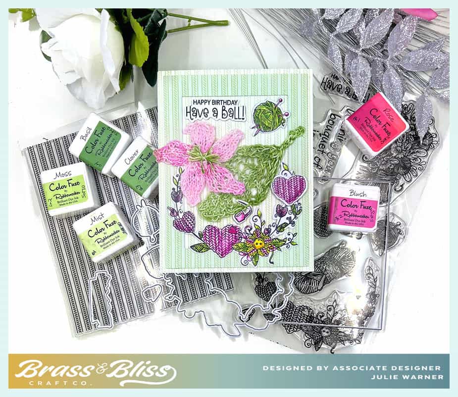The making of this card went quickly, thanks to the matching dies. The knitting of the leaf & flower took a little longer. Mainly because I had to find a couple of patterns & secondly because I didn’t have the right color of crochet thread. As you’ll notice in the picture with the Copic colors I used, I started with a white leaf, but wasn’t really happy with it. So I used a different pattern (here’s a link for the leaf, it’s a free pattern) & I used the green inks to swipe over the crochet thread before I knit with it. I did the same for the flower, using the pinks (here’s a link for the flower, also free). I used the size 10 crochet thread & size 2 (2.75mm) needles. I’ll warn you, it’s a little like knitting w/ toothpicks, if you’ve never worked with small needles & thread. I used the ticking background with the Mist ink on white & also on a pale green frame I cut using a rectangle die. Then all the items were arranged on top w/ the knitted flower & leaf added last. (Next time I’ll take a little more time to make the flowers but I was in a hurry!)