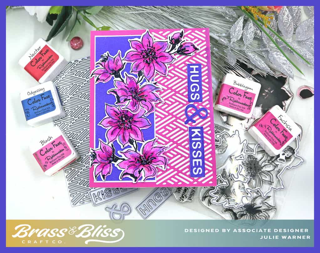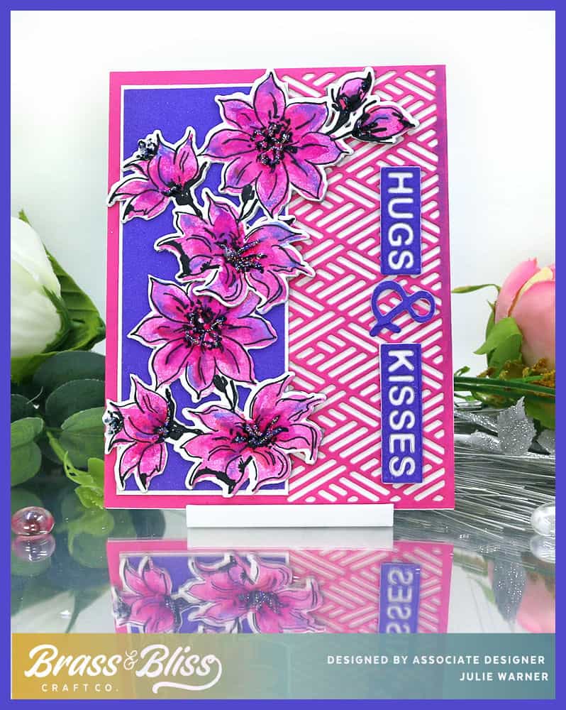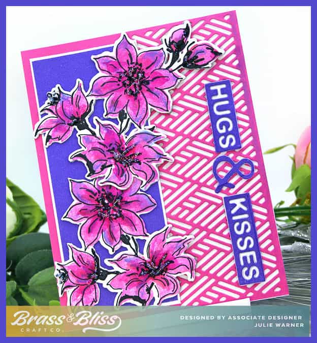 Today, I have a very bright floral card. These pinks and purples are really eye catching! The two part images make it easy to color without actually coloring. The matching dies make it a cinch to cut them out. A few dies and some inks are all you need!