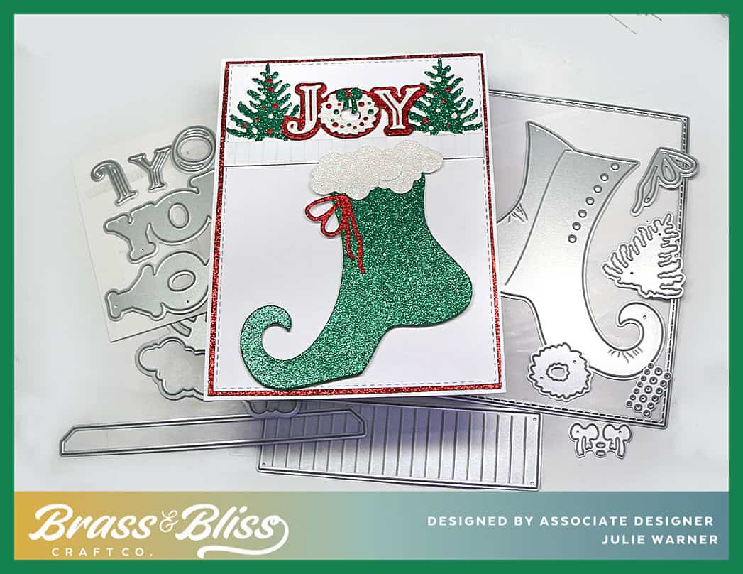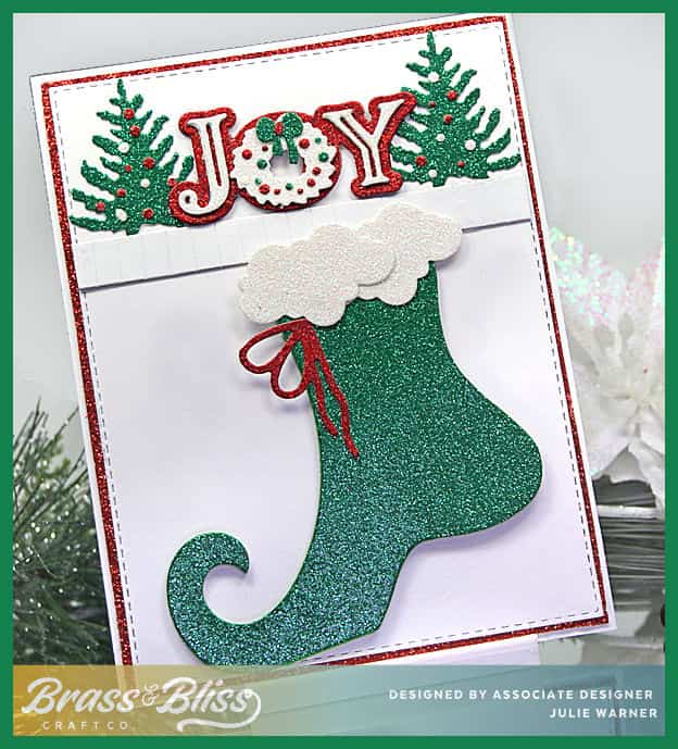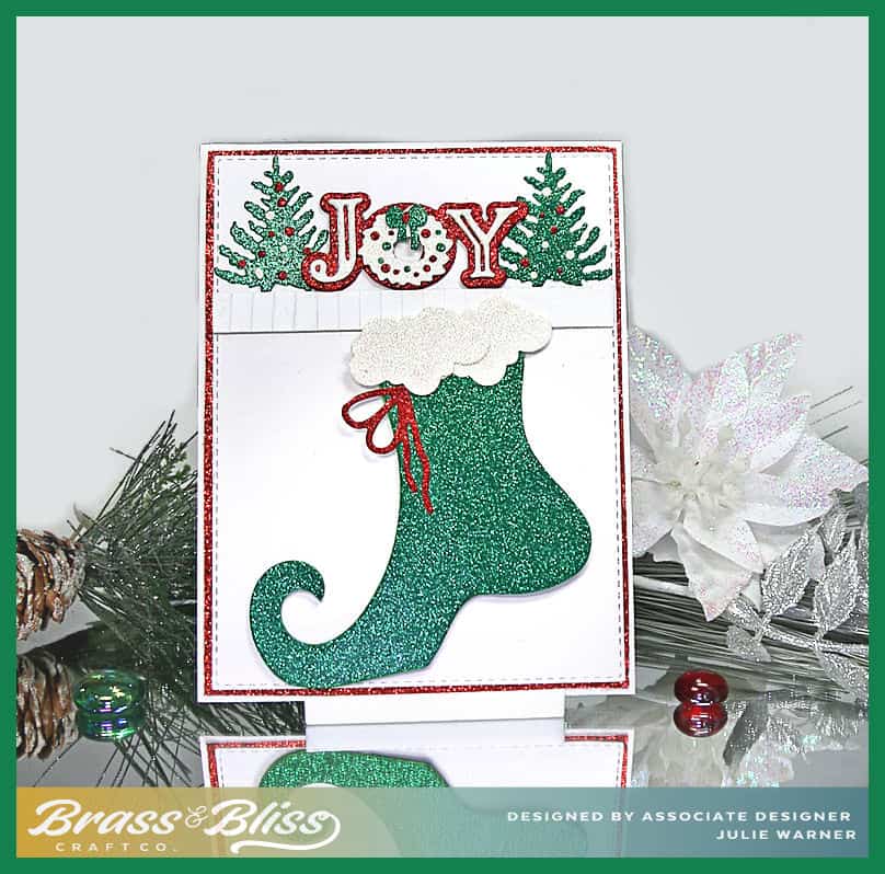 Today I have an easy, very glittery Christmas card. Everything except the white bead board mantle strip was die cut out of glitter card stock. I love sparkle for the holidays and the recipient is sure to love it, too. It’s also a great way to use that fancy Halloween boot for the winter holidays by turning it into an elf stocking!