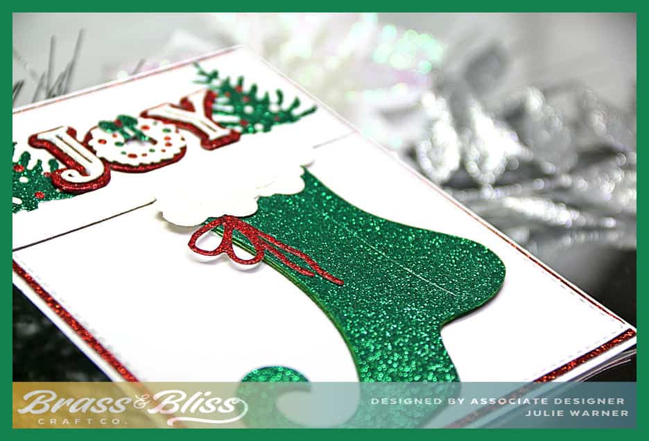 To make my elf stocking card, I die cut the boot out of green glitter card, & 2 of the cloud die out of white glitter w/ the string out of red glitter. I trimmed off the top of the boot to make it a little shorter, then put it all together & popped it up. The mantle is part of the Farmer’s Market die set & the little wreath & trees are part of the Farmer’s Market Winter Add On dies. The Joy was cut out of white, along with the wreath & the shadow was cut out of red. The white wreath was embellished with the ornaments & bow & used in place of the O in Joy. Love how it fits so well! The narrow red glitter is actually very narrow washi tape. I cut a piece of white just slightly larger than the stitched panel the attached the glitter washi tape around the edges before attaching the stocking panel.