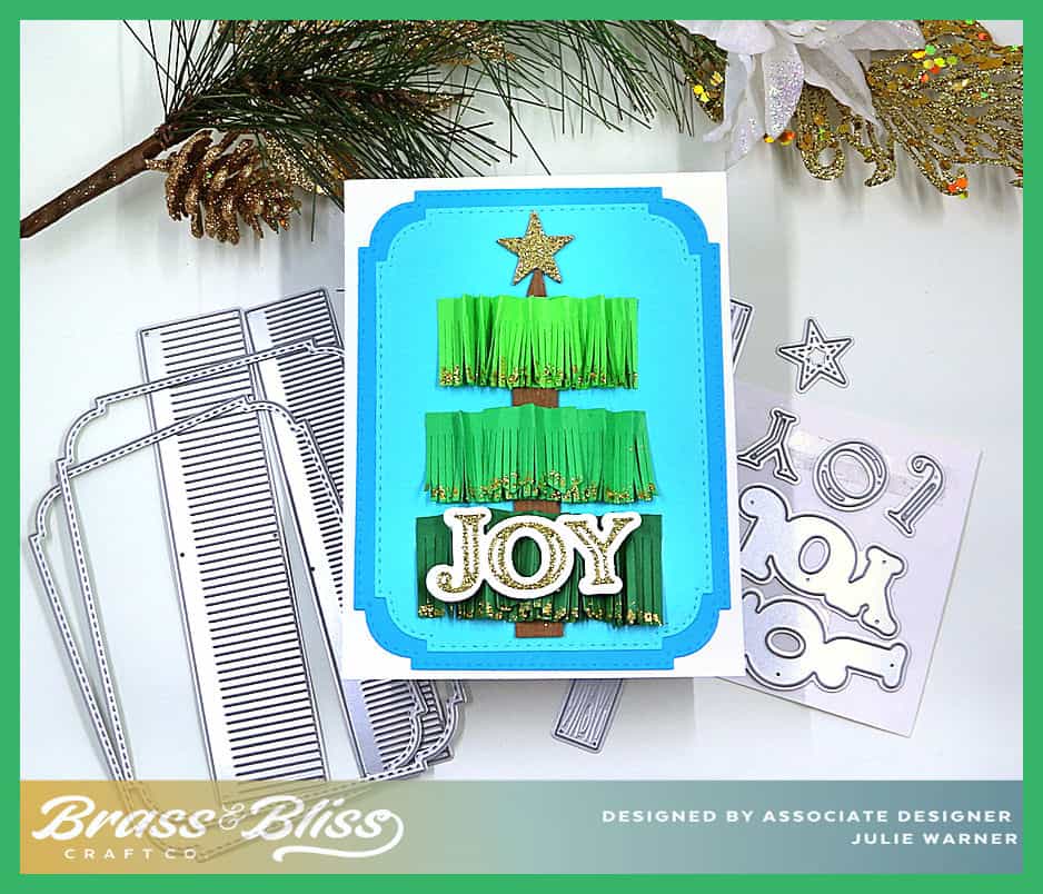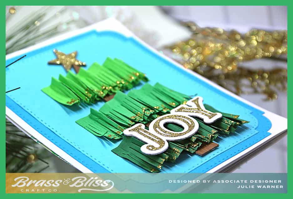 After die cutting 3 shades of green, 2 using the small fringe die & 1 using the medium fringe die, I fan folded them. The tree base is a die cut wood plank & I trimmed the top to narrow it. It’s popped up twice then the fan folded fringe was attached. I had a little extra fringe left over, so I trimmed the bottom in choppy layers & attached it over the centers of the fringe, then added a bit of gold glitter glue to the bottoms. The smallest star die was cut out of glitter paper, as was the JOY words. The Joy shadow is cut out of white glitter paper, popped up & added on top of the bottom fringe.