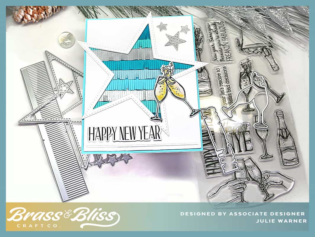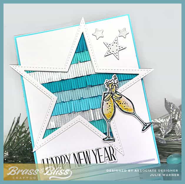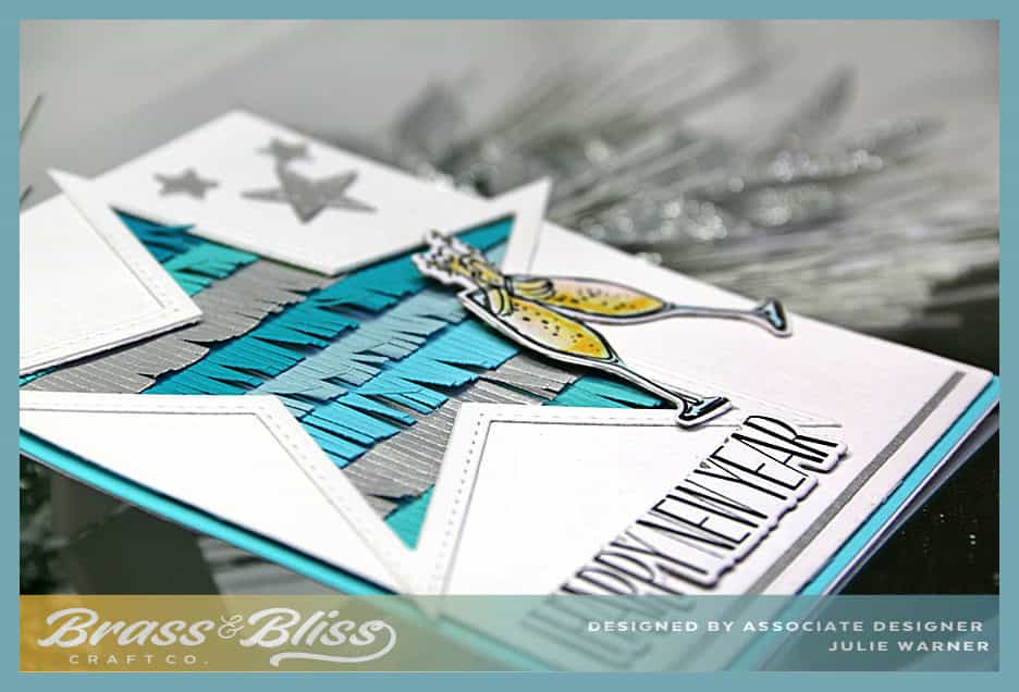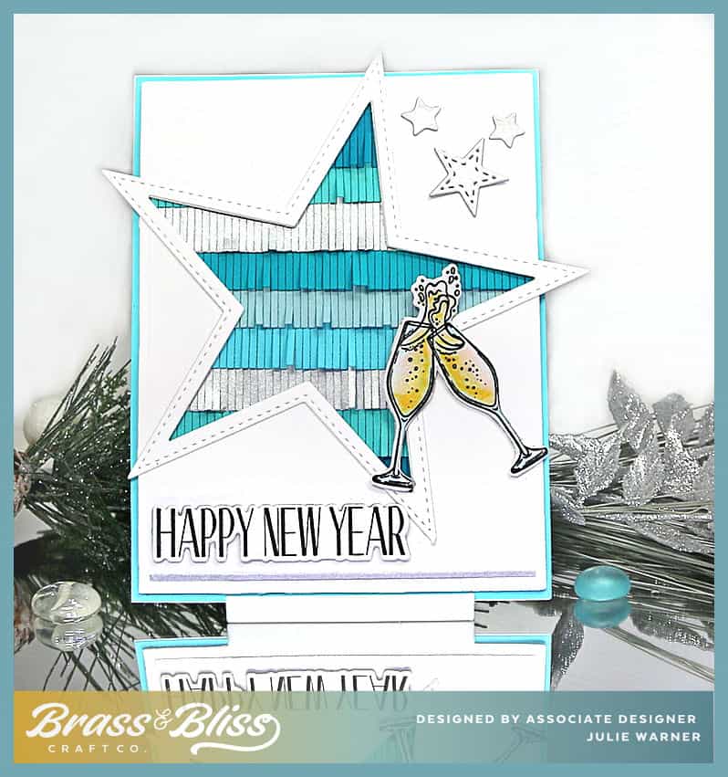 After cutting the white front, I used next to largest star die & cut it from the front on an angle. It just barely fit! I made the star frame w/ the largest die & cut out the center w/ the same die I used to cut the front. All of the fringe strips were cut out of shades of teal & a couple out of brushed silver, then layered on top of each other before attaching behind the star cut out. The greeting & champagne glasses were cut w/ their coordinating dies & attached on top. The smallest star of the stitched star dies & a couple of small stars from the String of Lights die were cut out of silver & added to the upper right corner.